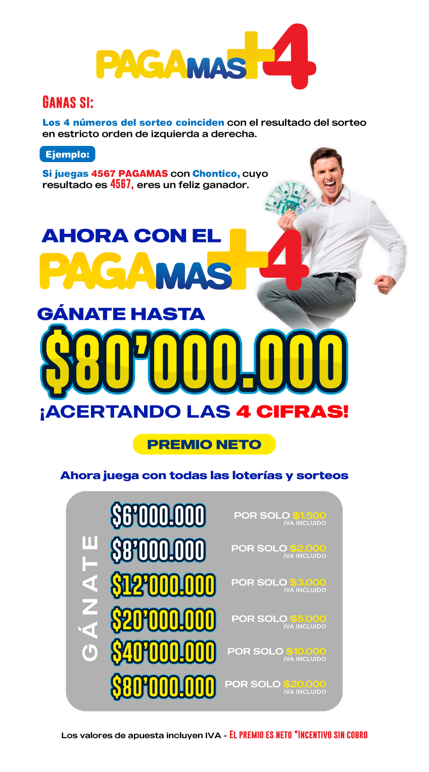 4 Cifras: El premio conservará el valor acumulado a la fecha, para tal fin consultar Tabla de Premiación Doblechance.